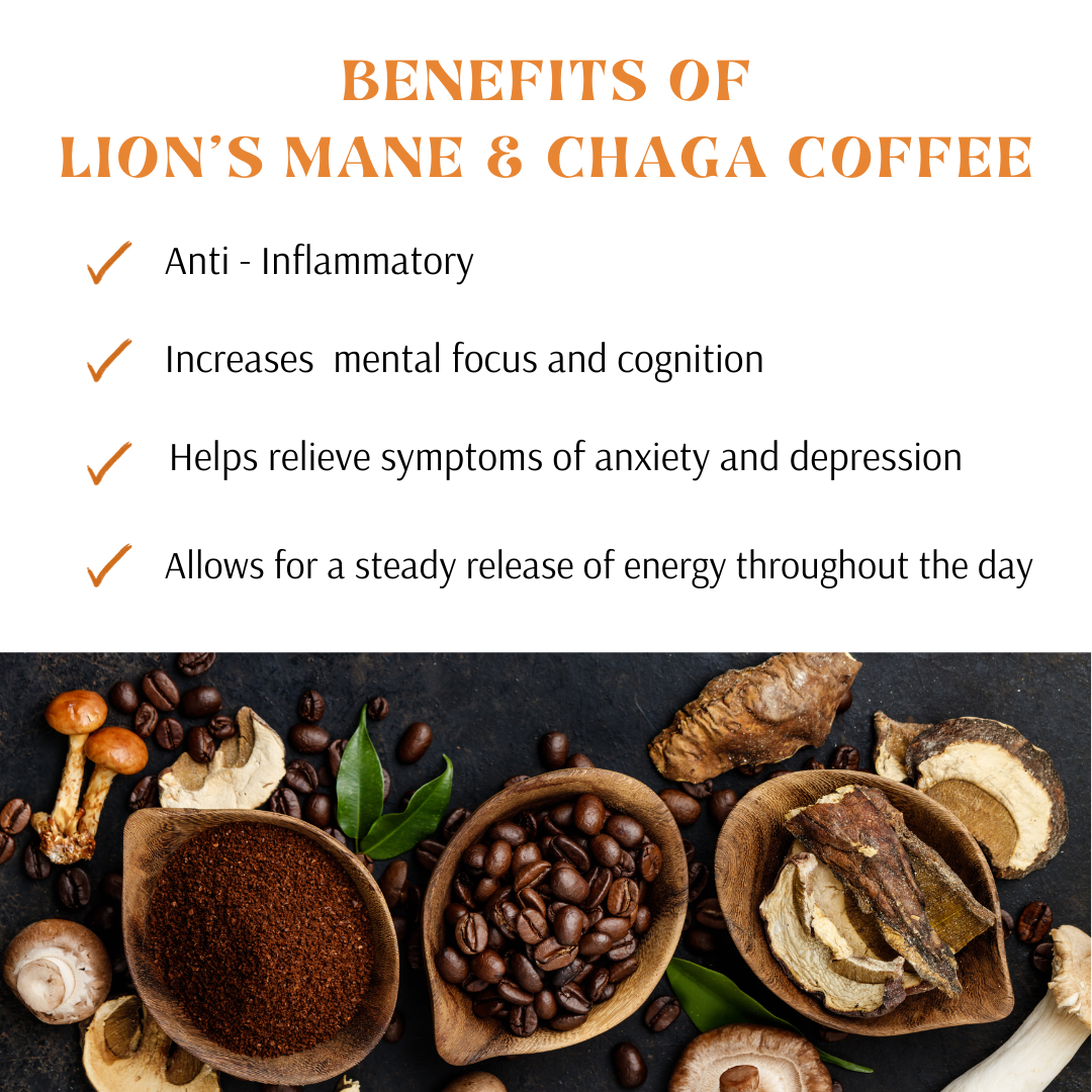 Ingredients: Arabica Coffee, Lion's Mane Mushroom Powder, Chaga Mushroom Powder.